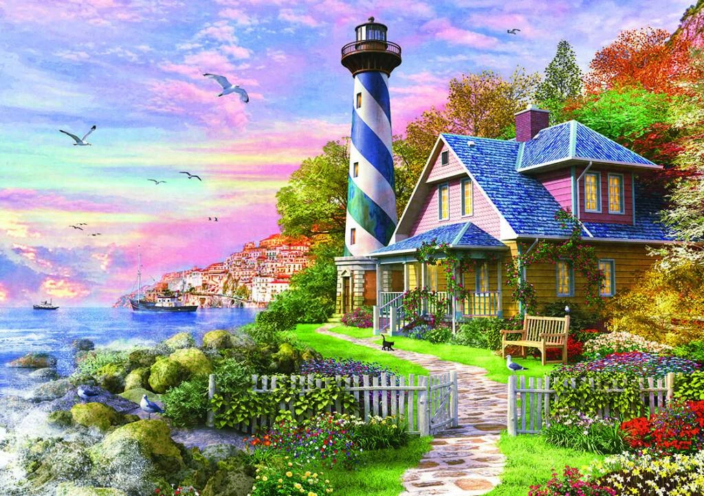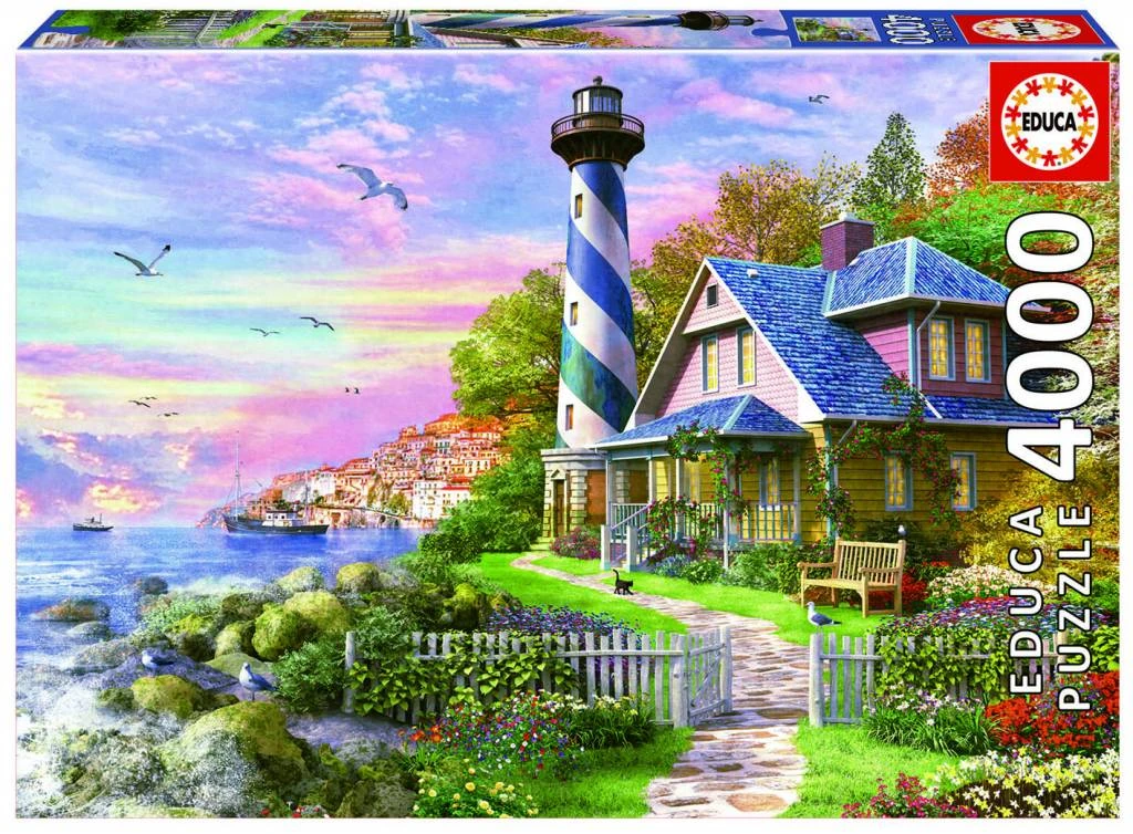 Puzzel van 4000 stukjes met wit/blauwe vuurtoren naast cottage. Deze puzzel bestaat ook in 1000 stukjes.