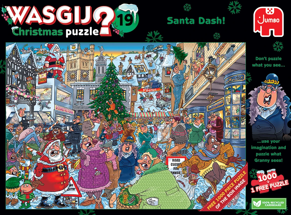 ‘Santa Dash!’ is de titel van deze feestelijke Wasgij Christmas 19, 2 x 1000-delige legpuzzelset.